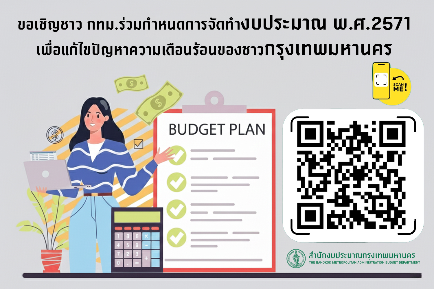 สำนักงบประมาณกรุงเทพมหานครได้จัดกิจกรรมสร้างการมีส่วนร่วมในการจัดทำงบประมาณรายจ่ายประจำปี เพื่อให้ประชาชนมีส่วนร่วมกำหนดงบประมาณของกรุงเทพ ประจำปีงบประมาณ พ.ศ.2571 โดยสร้างช่องทางการมีส่วนร่วมในการจัดทำงบประมาณรายจ่ายให้สามารถแก้ไขปัญหาความเดือดร้อนตรงตามความต้องการของประชาชน