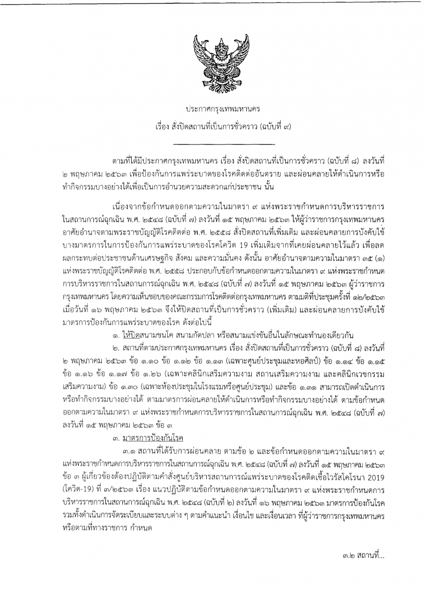 ประกาศกรุงเทพมหานคร เรื่อง สั่งปิดสถานที่เป็นการ1ชั่วคราว (ฉบับที่ 9)