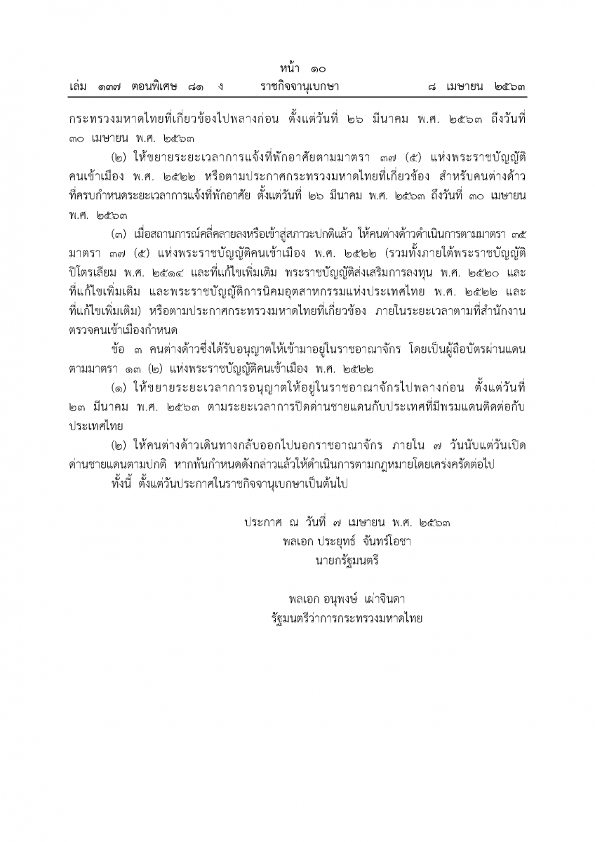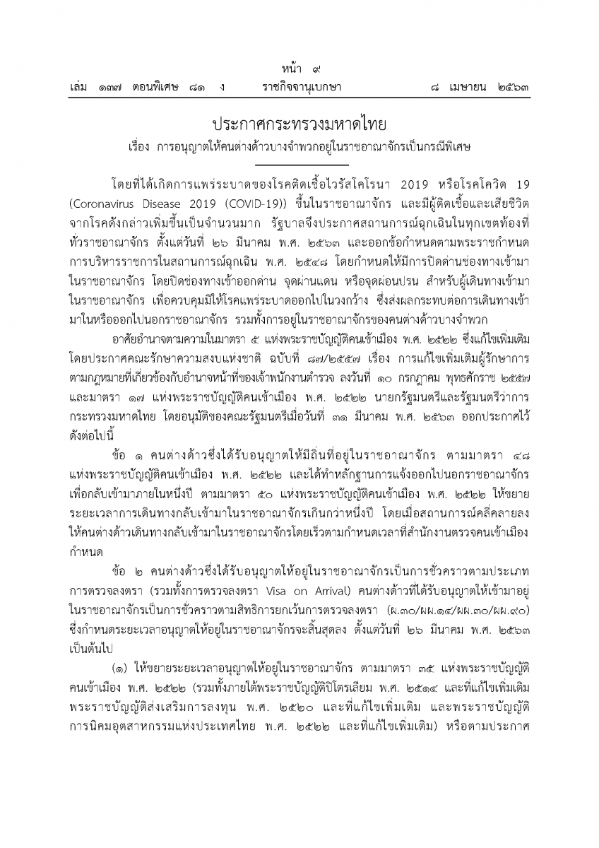 ประกาศกระทรวงมหาดไทย เรื่อง การอนุญาตให้คนต่างด้าวบางจำพวกอยู่ในราชอาณาจักรเป็นกรณีพิเศษ ลงวันที่ 7 เมษายน พ.ศ. 2563