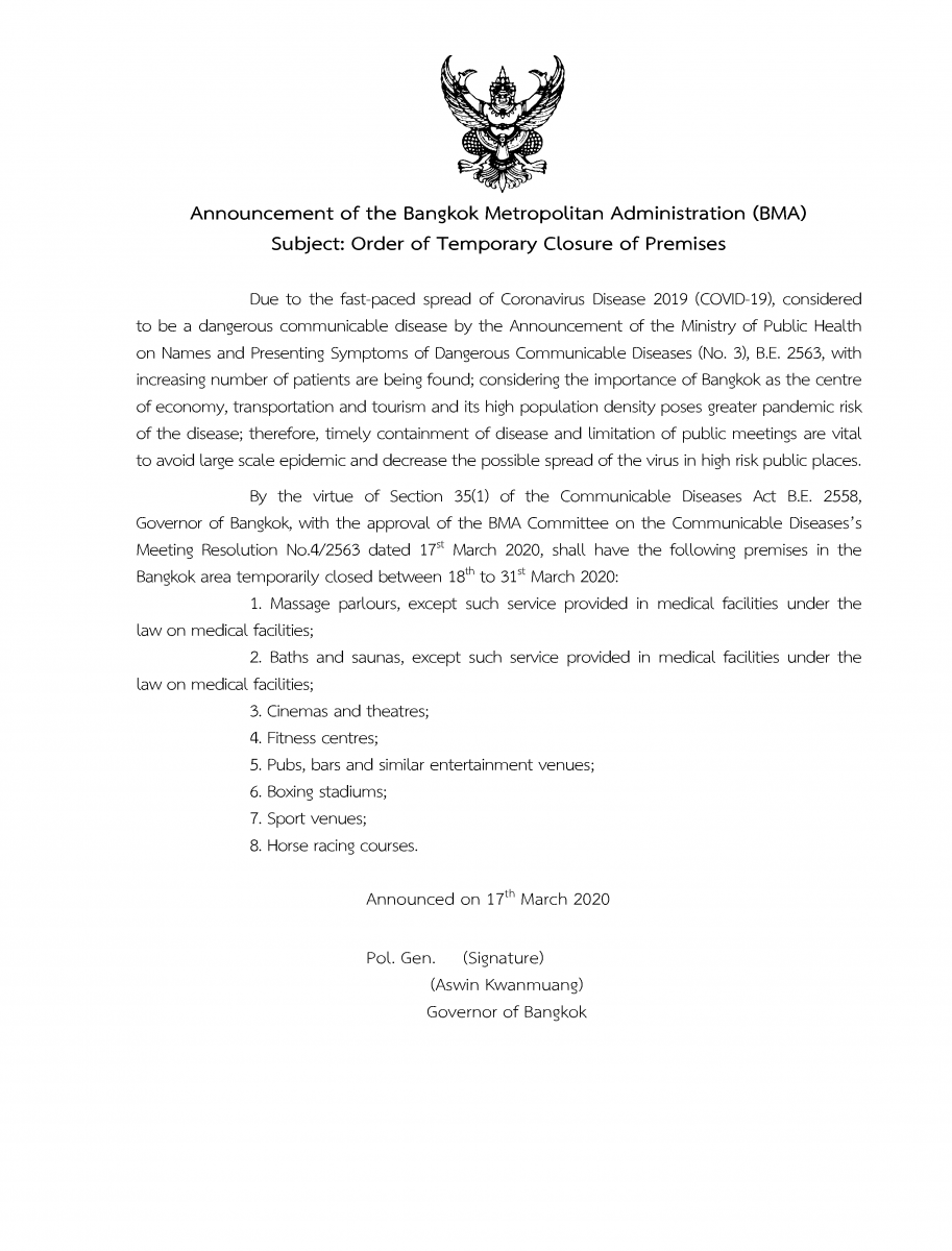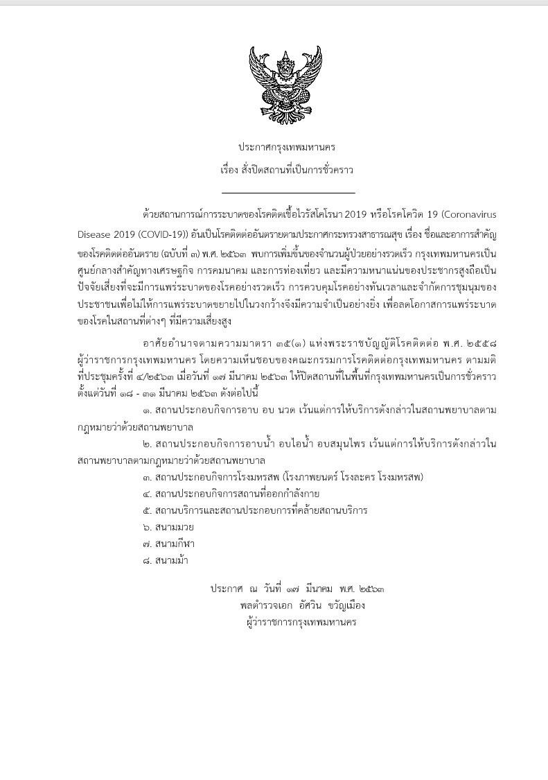 เรื่อง สั่งปิดสถานที่เป็นการชั่วคราว (ฉบับที่ 1)