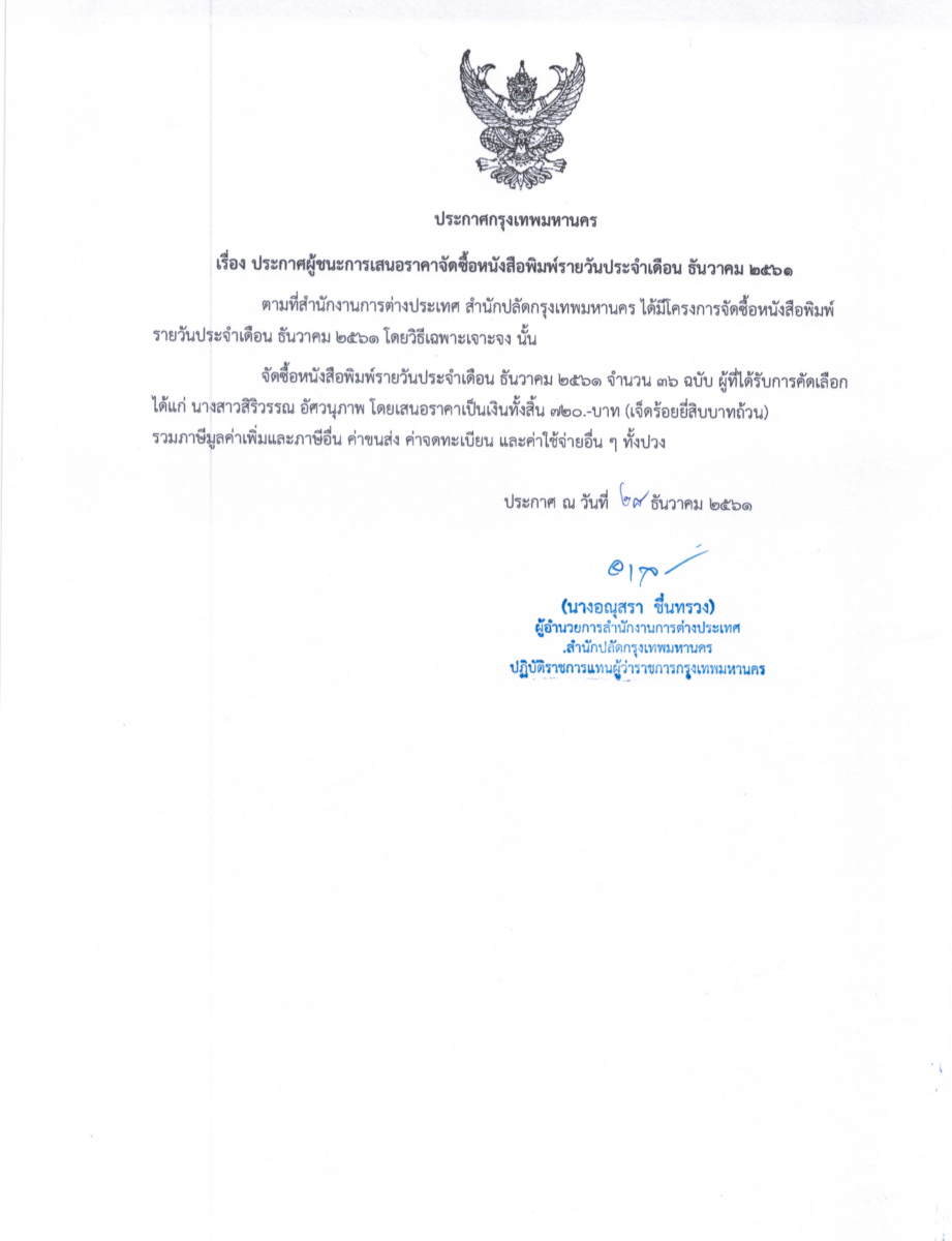 ประกาศผู้ชนะการเสนอราคาจัดซื้อหนังสือพิมพ์รายวันประจำเดือน ธันวาคม