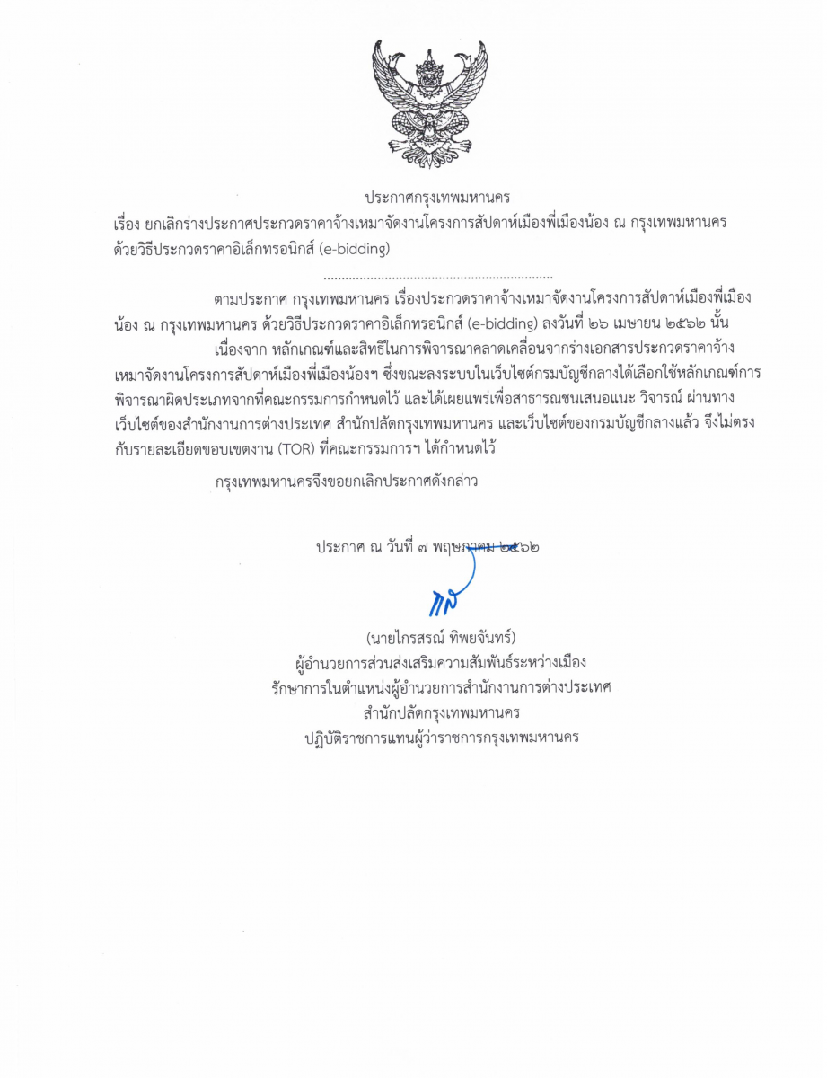 ยกเลิกร่างประกาศประกวดราคาจ้างเหมาจัดงานโครงการสัปดาห์เมืองพี่เมืองน้อง
