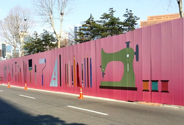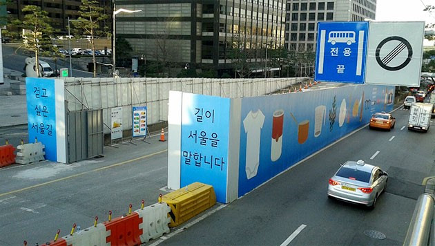 กรุงโซลออกแบบรั้วกั้นในระหว่างการก่อสร้างทางยกระดับ โดยใช้ภาพส่วนขาของประชาชนที่กำลังเดินบนทางเดินสีเขียว พร้อมกับภาพธุรกิจต่าง ๆ และวัฒนธรรมที่แสดงถึงพื้นที่สถานีโซล