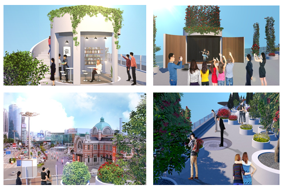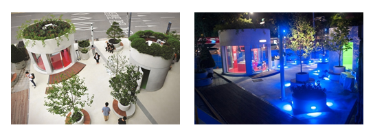On the walkway, large tree pots (six general pots and four bench pots) and lighting illuminating night landscapes are installed, creating a small garden where citizens can rest.