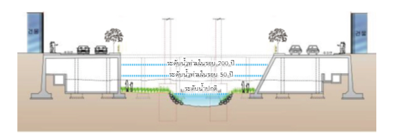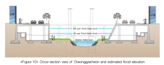 Although the restoration of Cheonggyecheon was initiated in a bid to restore historical and environmental values, the safety issues including flood prevention came to the fore in the course materialization. The city set the target flood recurrence interval of 200 years. Given that other 2nd-grade local streams were managed based on 50-year interval assumption, it was a decision to better ensure the citizens' safety by securing sufficient stream capacity to deal with local torrential rainfalls. The city also strived to secure discharge area by excavating the underneath of both banks.