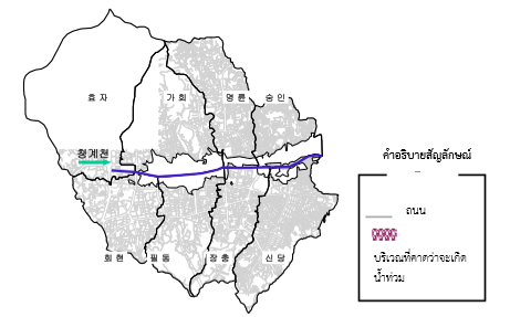 ภาพคลองชองกเยชอนตามแนวขวาง และประมาณการระดับน้ำท่วม