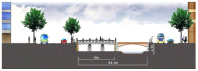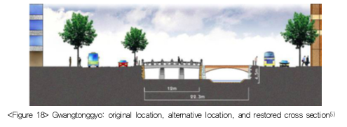 Restoration of historical values was important in justifying the project and ensuring citizens' support. With this recognition, the Seoul municipality set it a principle to preserve all the heritage excavated during the construction. In the actual work, however, the safety of citizens emerged as a bigger priority. The municipality's principle was to restore the originality to the extent in which citizens' safety from flood and other risks is ensured. However, some members of the citizens' committee and some civil associations insisted that the stream be restored entirely in its originality. Such a difference sharpened in the phase of actual work. As specific concerns emerged with regard to flood control, transportation and negotiations with the neighbor businesses, some of them became incompatible with the preservation of historical remains.One of the biggest issues was the restoration of Gwangtonggyo bridge. There was a strong argument to restore it to its original shape, which required an extensive work. In order to secure enough cross-sectional area for the water flow, in other words discharge area, it was necessary to purchase private lands in the bridge's vicinity, but it was practically impossible. Insufficient area for discharge would lead to failure in safety and flood control. The city finally decided to rebuild Gwangtonggyo at a spot 150m away from the original location to the upstream, in a belief that restoration at the original location will be possible in the future when a better condition is prepared.
