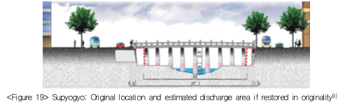 Restoration of Supyogyo in its originality might incur similar problems. The Cultural Heritage Committee of Seoul concluded to leave Supyogyo where it was, in the Jangchungdan Park, in order to avoid deterioration of the original stones. At 27.5m, the original Supyogyo was longer than the width of the restored stream (22m) at the point. To restore it in the original shape, the city had to expropriate private properties in the vicinity, which would inevitably prolong the construction and cause more inconvenience for the neighboring businesses. Therefore, the municipality decided to restore Supyogyo in the future, once favorable conditions are made available.