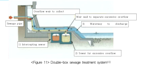 Substantial number of sewerage pipes were buried near Cheonggyecheon, since sewage water of the downtown Seoul was traditionally gathered along it. Finding ways to treat such sewage was a precondition to the restoration. Since the existing sewerage system was often combined with rainwater collection system before it reached the stream, it was practically impossible to segregate sewage from rainwater. Separation between them was also inappropriate because the downtown rainwater flowing into Cheonggyecheon was highly polluted. Therefore, the municipality adopted a double-box system. The sewage would be treated in a combined system, but highly-polluted initial rainfall would be segregated into a separate pipeline to be treated at the treatment facilities, not flowing into the stream.