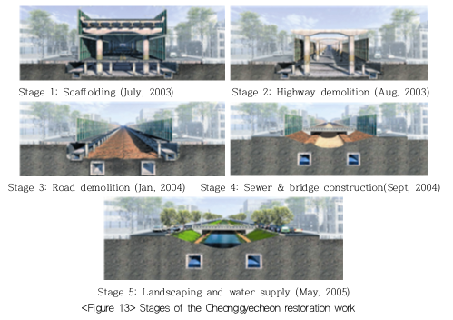 การบูรณะคลองชองกเยชอนในระยะต่าง ๆ