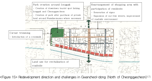 When it comes to the redevelopment of the stream's vicinity, controversy have persisted over whether the small plots and lower buildings have to be prioritzed for preservation of the small alleys and the historical values of the downtown, or the larger plots and higher buildings have to be prioritized to provide a public space. As seen in the changing height regulations, the directions to define the identity and usage of the downtown has continued to change. It was therefore important to balance between preservation of the memories of the past and the accommodation of people's new aspiration in the land use. To this end, a detailed redevelopment strategy was necessary to adapt to distinctive land use patterns and identities of each block.