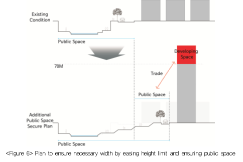 In the aspect of revitalization, the biggest problem of land use pattern around Cheonggyecheon was an absolute lack of green space and public space for the citizens to walk around and rest, other than Cheonggyecheon road. The elevation difference between the ground level and the stream were considerable because of the flood control. Also, the stream was too narrow to create a gradual slope to connect it to the ground level. Moreover, bigger width needed to be secured to make Cheonggyecheon a more naturally-looking curved stream in the longer term. To ensure sufficient width, the city had to buy the land from the owners of private properties in the vicinity, but purchasing neighboring properties would be an extremely time- and money-consuming process. Another way to prevent losses in the private sector and ensure public space was to secure public land through negotiation. When the private owners hand over a part of the land for public usage, the public gave them incentives to allow the building developed higher. Physically speaking, the municipality horizontally secured public space while allowing more developments vertically.