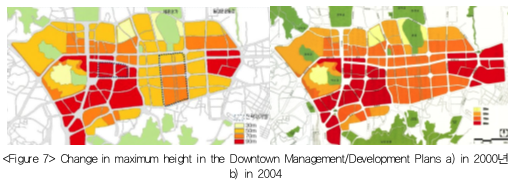 Easing the height regulations might undermine the effort to control the downtown skyline, but it was a practical way for the city to secure public space by compensating the private sector's losses. Purchase was practically almost impossible due to enormous financial burden, prolonged administrative processes and complicated interests of many small plot owners. In such a context, the height regulation in the vicinity of Cheonggyecheon was eased. Looking at height regulation of the downtown plan, many 50 meter limit zones in the 2000 plan became the 70 meter zones in the 2004 plan.