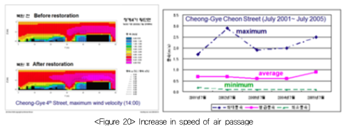 Physical change and reduced traffic volume in the Cheonggyecheon area reportedly reduced the concentration of fine dust  (PM-10), NO2, volatile organic compound (VOC) and other air pollutant in a significant level, shorty after the restoration. The heat island effect in the downtown also declined. The temperature of the Cheonggyecheon area before the restoration was 2.2℃ higher than the average of Seoul, but it declined to 1.3℃ after the restoration, dropping by 8 to 18%. The temperature of green point within the stream was 0.9℃ lower than neighboring area, As air-blocking elevated highway disappeared, wind corridor was established and the creation of stream affected neighboring environment. Ecosystem was also restored as wildlife fish species, birds, insects and plants increased.