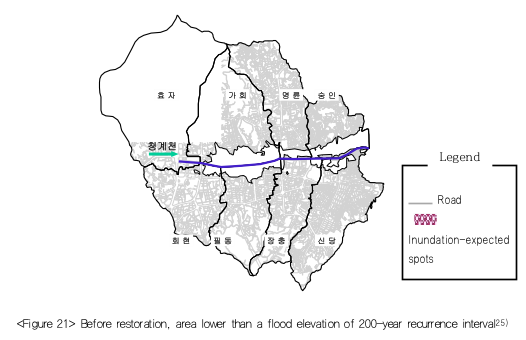 Cheonggyecheon is the lowest-lying area in the old downtown with an extensive basin to collect rainwater and gently sloped banks, which make it a highly flooding-prone stream. Overflow occurred for two consecutive years before the restoration began, causing damage in the downtown area. Given that local torrential rainfall is frequent in Seoul, discharge area of the restored stream was designed on the basis of 200-year recurrence interval. While the estimation at 200-year recurrence interval had revealed that most of the low-lying area around Cheonggyecheon had been subject to inundation before the restoration, there was no report of flooding due to lack of discharge area after the restoration, which means that the vicinity was made free from flooding damage.