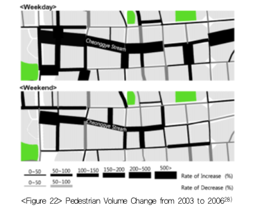 Politicalization of the Cheonggyecheon restoration was a double-edged sword. While the political momentum certainly drove the restoration project more powerfully, the project became a subject of political controversy, rather than a factor of urban revitalization. It also became a matter of political strife in the mayoral election every four years. Despite the necessity of long-term management, the public sector could not fully ensure the consistency in managing the Cheonggyecheon restoration and urban revitalization efforts. It is unfortunate that the task of urban revitalization exclusively fell to private sector, due to the absence of public intervention.