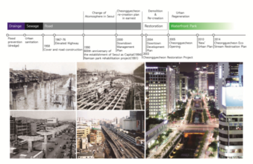 public space is an important asset in the city. Securing and utilizing it determines the quality and competitiveness of the city. The primary function of Cheonggyecheon in the downtown Seoul has changed over time. During the Joseon dynasty, the main role of Cheonggyecheon in the city of 100,000 population was "drainage" and flood prevention, while the function of "sewage" became important as population grew since the 20th century. After the Korean War, the population of Seoul skyrocketed and an open sewer like Cheonggyecheon became inappropriate due to diseases and odor, while roads became necessary in the process of industrialization. Accordingly, Cheonggyecheon was covered with roads since 1958 and an elevated highway was constructed. Since then until the 2000s, the main function of Cheonggyecheon was 'road,' Today, it is important to create a natural ecological park where people can breathe and relax in the downtown and walk around. As such, the main role of Cheonggyecheon has evolved. However, such a creative destruction of public space to create it anew requires thinking out of the box. Also, new technologies and dedication are essential to make the new ideas into a reality. A public space is not a fixed one. it can evolve.