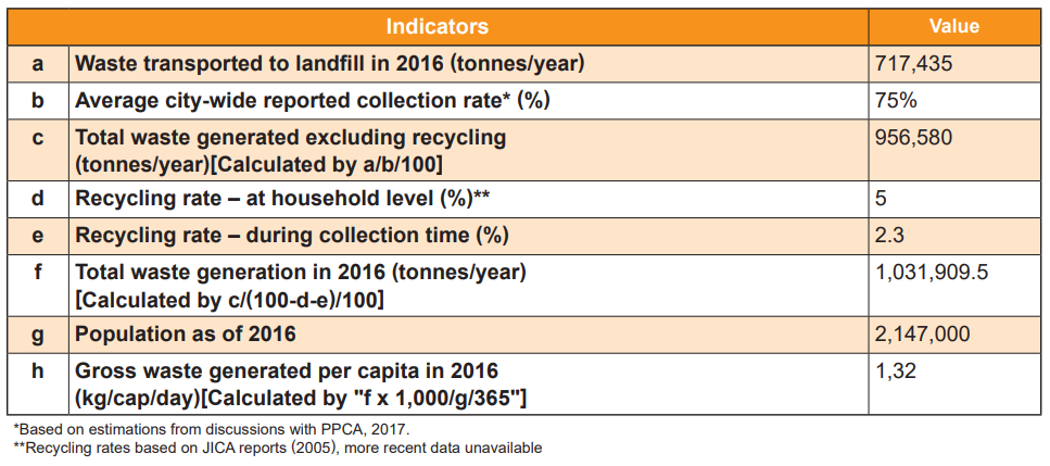 Gross waste generation rate per capita is calculated by dividing the total waste collected by the population, thus varies in line with changes in population or waste collection ratio in the city. Based on information from various sources, the gross generation rate was found to increase from 0.74 kg/capita/day in 2003 (Seng et al., 2010) to approximately 1.32 kg/capita/day in 2016 (calculated by drafting team based on 2016 data).
