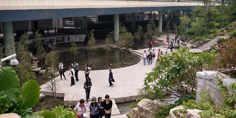 The Donghaochong Greenway in Guangzhou is a model for creating green spaces for recreation and increased mobility in a highly congested city. It features a landscaped corridor with winding walkways and bicycle paths, and a restored stream under an elevated highway.