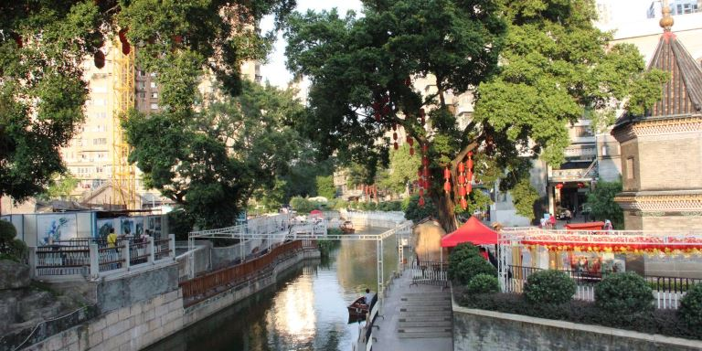 Donghaochong Canal has existed since the Song Dynasty. It was used in urban defense and as a transport corridor, sewer, and stormwater spillway. The stream flows into the Pearl River and it is the only major north-south channel in the city that has not been covered. An elevated expressway stands over it.