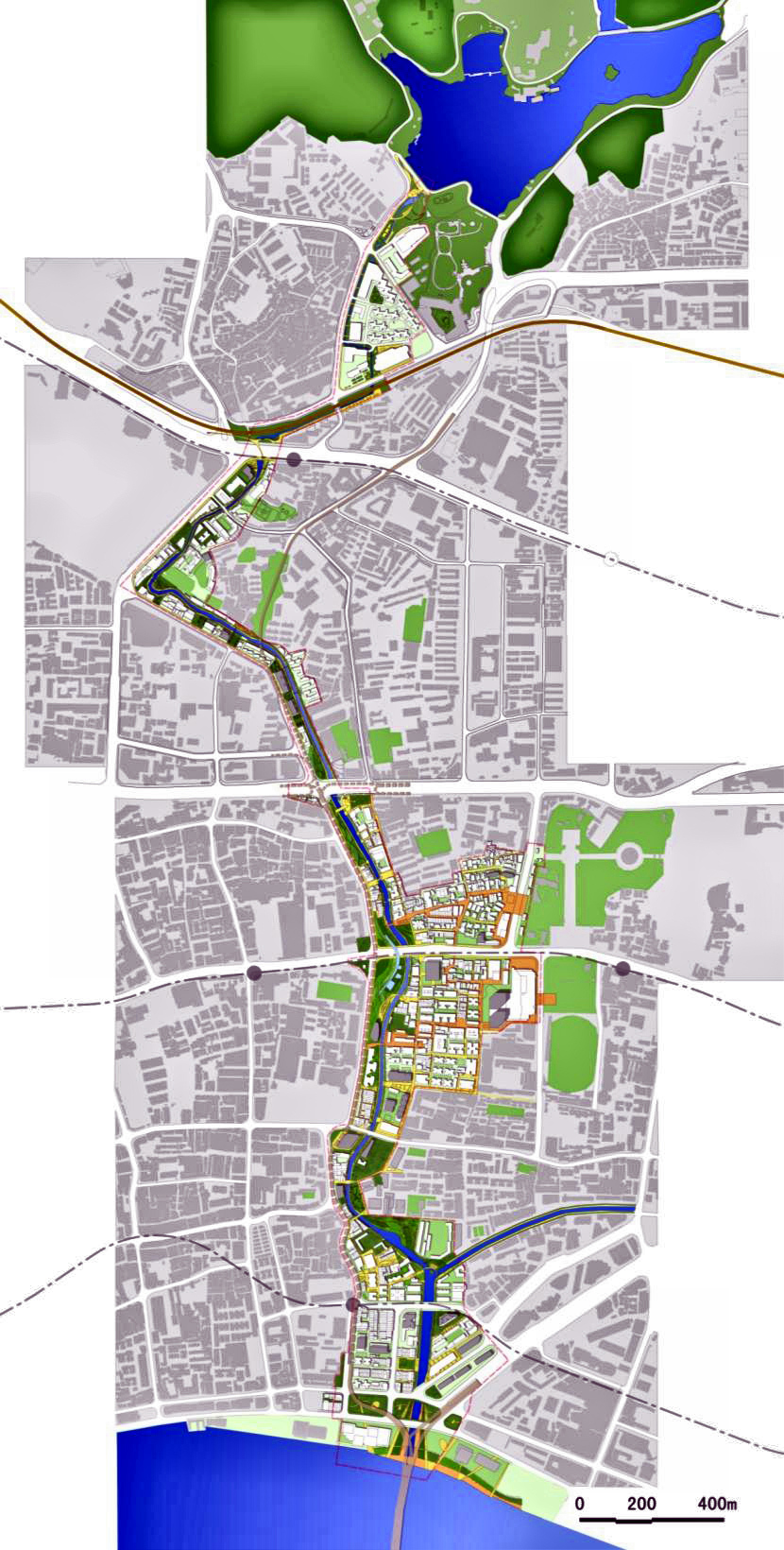 Most of the greenway is located along the canal except for its northern section, which passes through a densely populated area.