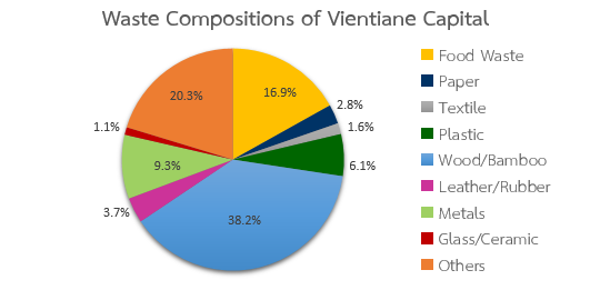 • Compositions of wastes are as follows: food waste = 16.9%, paper = 2.8%, textile = 1.6%, plastic = 6.1%, wood/bamboo = 38.2%, leather/rubber = 3.7%, metals = 9.3%, glass/ceramic = 1.1%, others = 20.3%