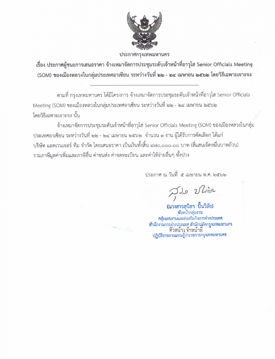 จ้างเหมาจัดการประชุมระดับเจ้าหน้าที่อาวุโส Senior Officials Meeting (SOM) ของเมืองหลวงในกลุ่มประเทศอาเซียน ระหว่างวันที่ 22 – 24 เมษายน 2562
