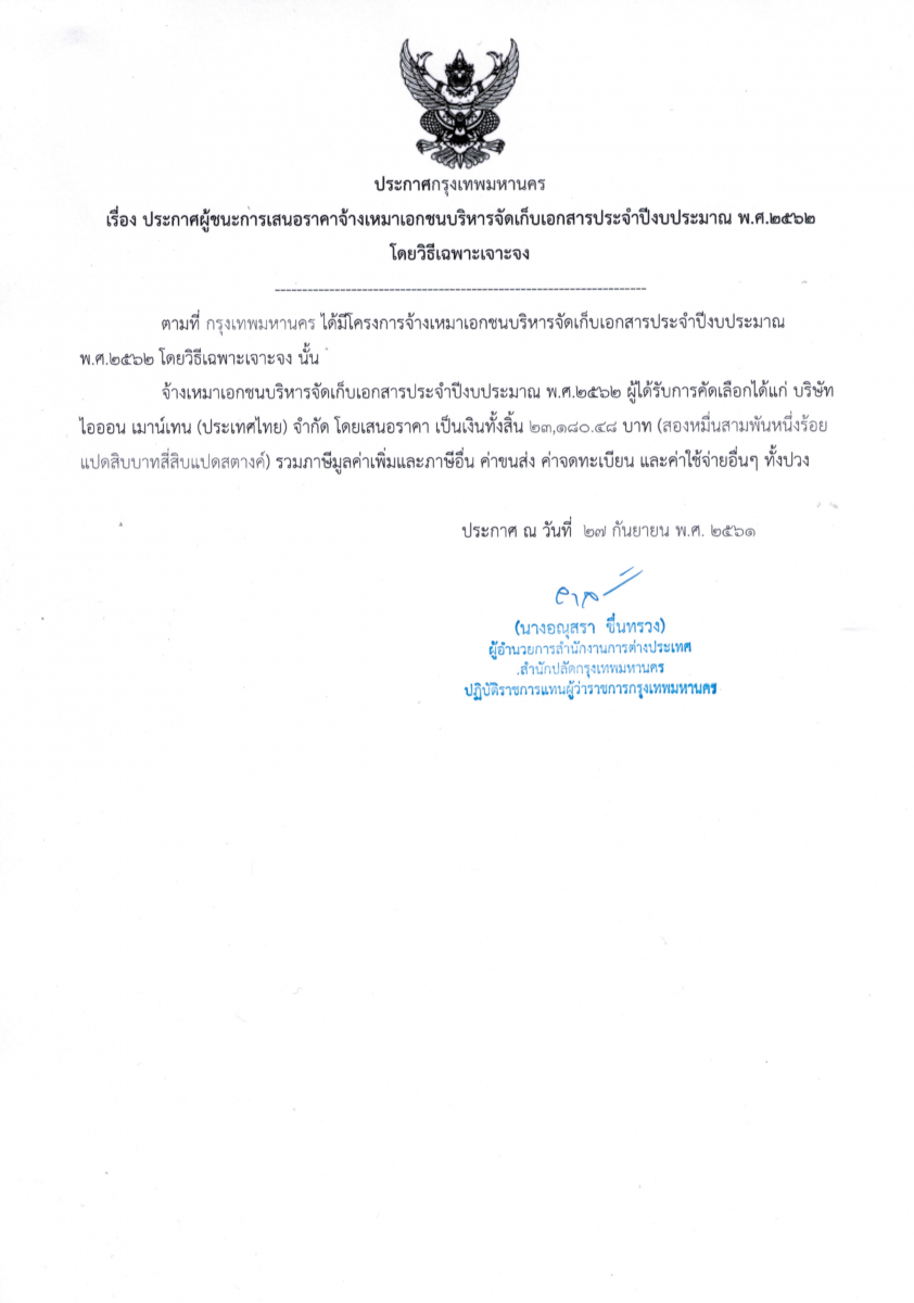 ประกาศผู้ชนะการเสนอราคาจ้างเหมาเอกชนบริหารจัดเก็บเอกสารประจำปี พ.ศ.2562