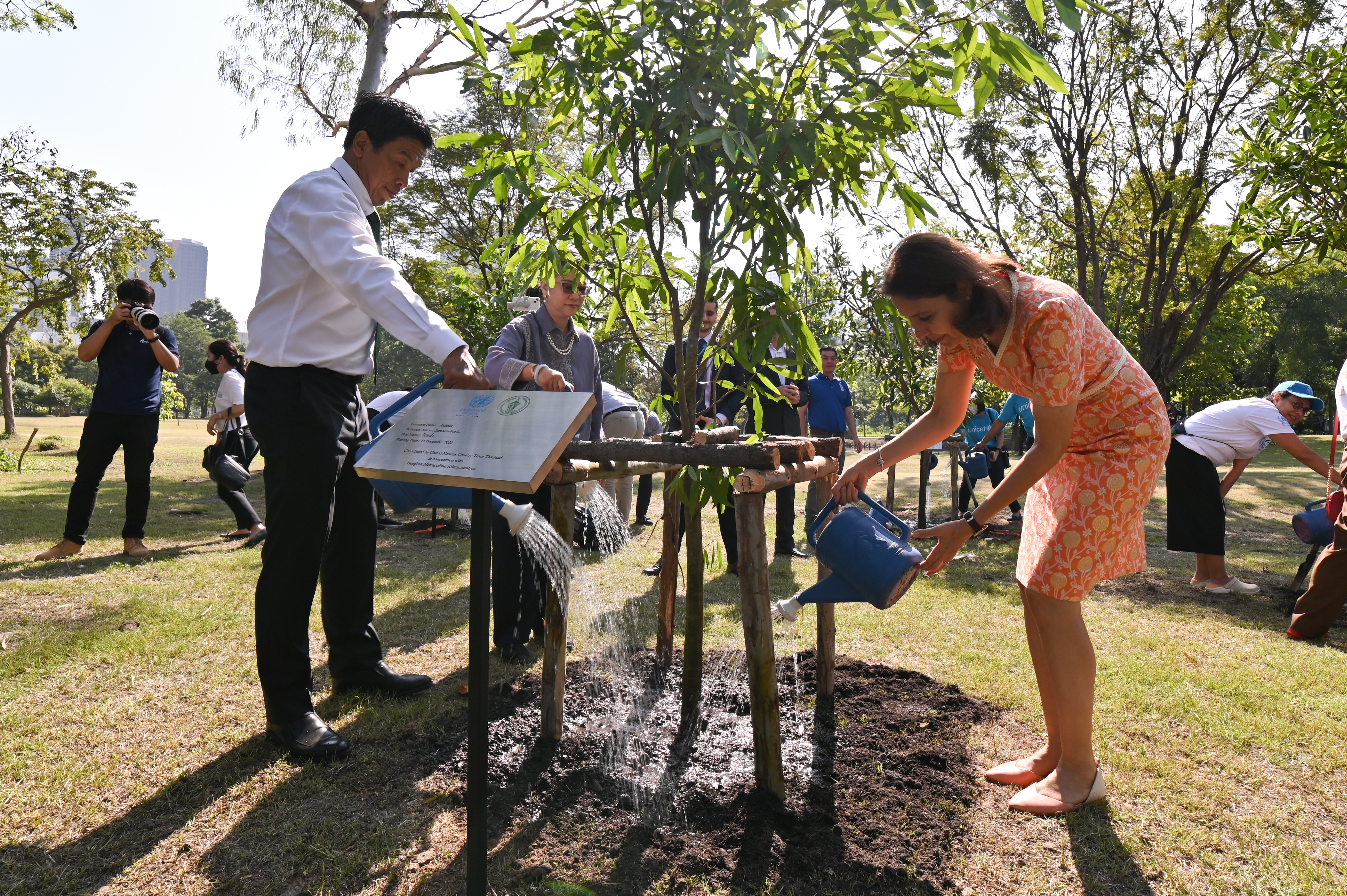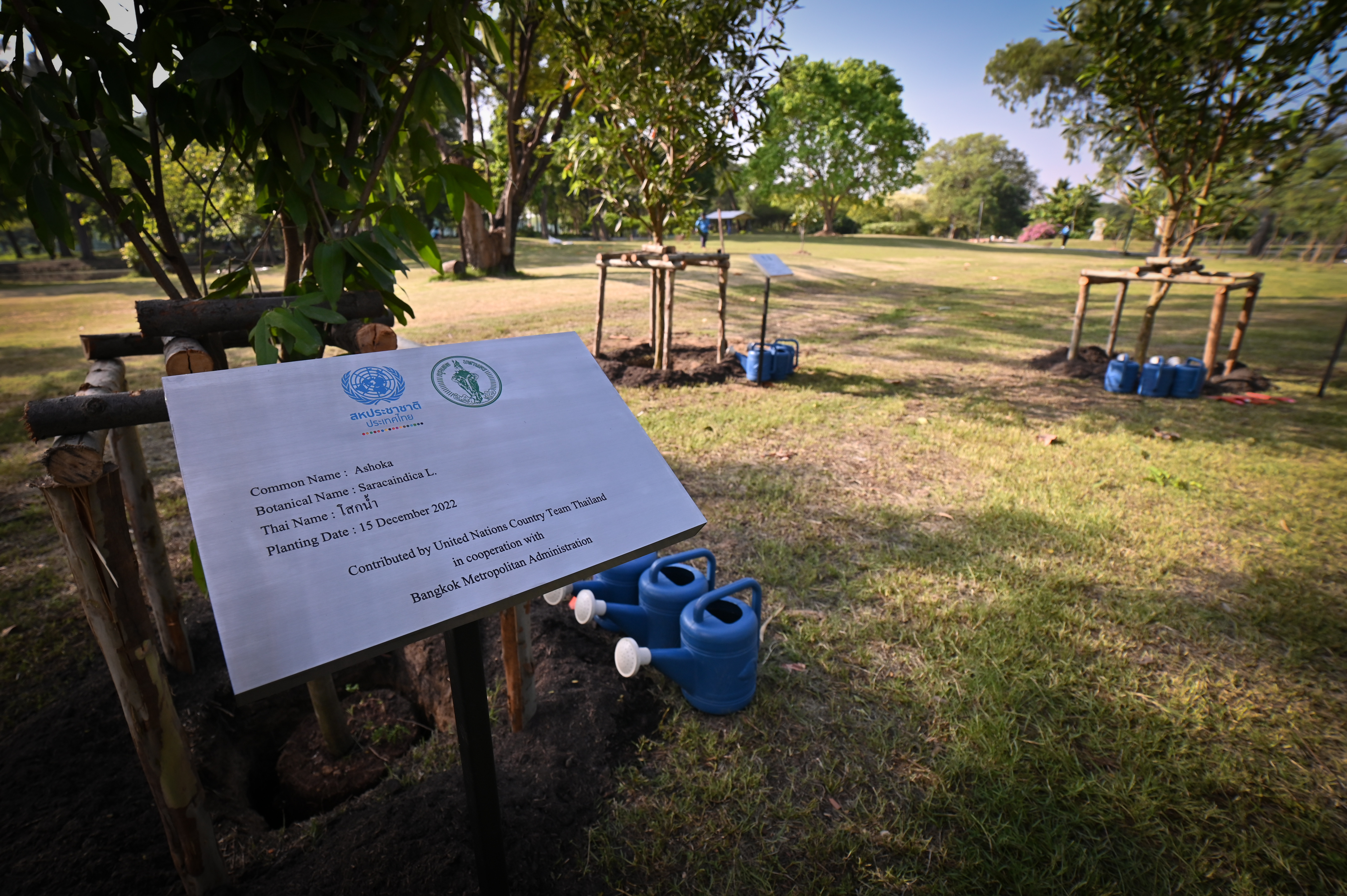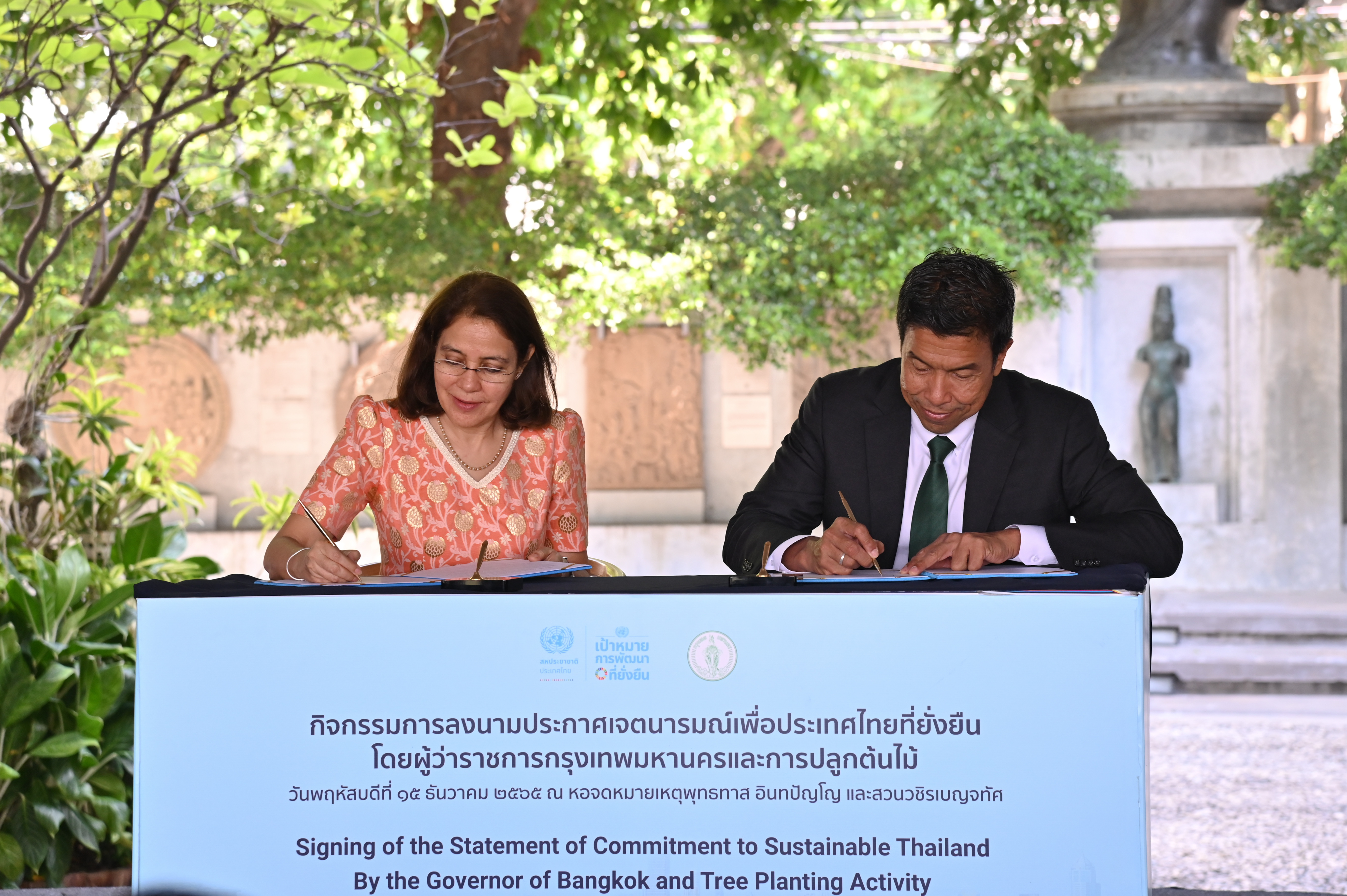 (15 ธ.ค.65) เวลา 10.00 น. : นายชัชชาติ สิทธิพันธุ์ ผู้ว่าราชการกรุงเทพมหานคร ลงนามประกาศเจตนารมณ์เพื่อประเทศไทยที่ยั่งยืน ร่วมกับนางกีต้า ซับบระวาล ผู้ประสานงานสหประชาชาติประจำประเทศไทย (UN) เพื่อส่งเสริมและสร้างความตระหนักรู้ด้านเป้าหมายการพัฒนาที่ยั่งยืน (Sustainable Development Goals–SDGs) ภายในกรุงเทพมหานคร ผ่านการร่วมมือกับสหประชาชาติ พ.ศ. 2565 - 2569 และร่วมกิจกรรมปลูกต้นไม้ จำนวน 4 ต้น ประกอบด้วย ต้นโสกน้ำ (Ashoka Tree) จำนวน 2 ต้น ต้นไคร้ย้อย (Fairy Petticoats) จำนวน 2 ต้น โอกาสนี้องค์การสหประชาชาติประจำประเทศไทย (UN) มอบต้นไม้ให้กรุงเทพมหานครเพื่อนำไปปลูกตามนโยบาย “ปลูกต้นไม้ล้านต้น สร้างพื้นที่สีเขียวและกำแพงกรองฝุ่นทั่วกรุง” จำนวน 100 ต้น ประกอบด้วย ต้นกล้าพะยูง ต้นกล้ากันเกรา ต้นกล้าประดู่ป่า และต้นกล้ากัลปพฤกษ์