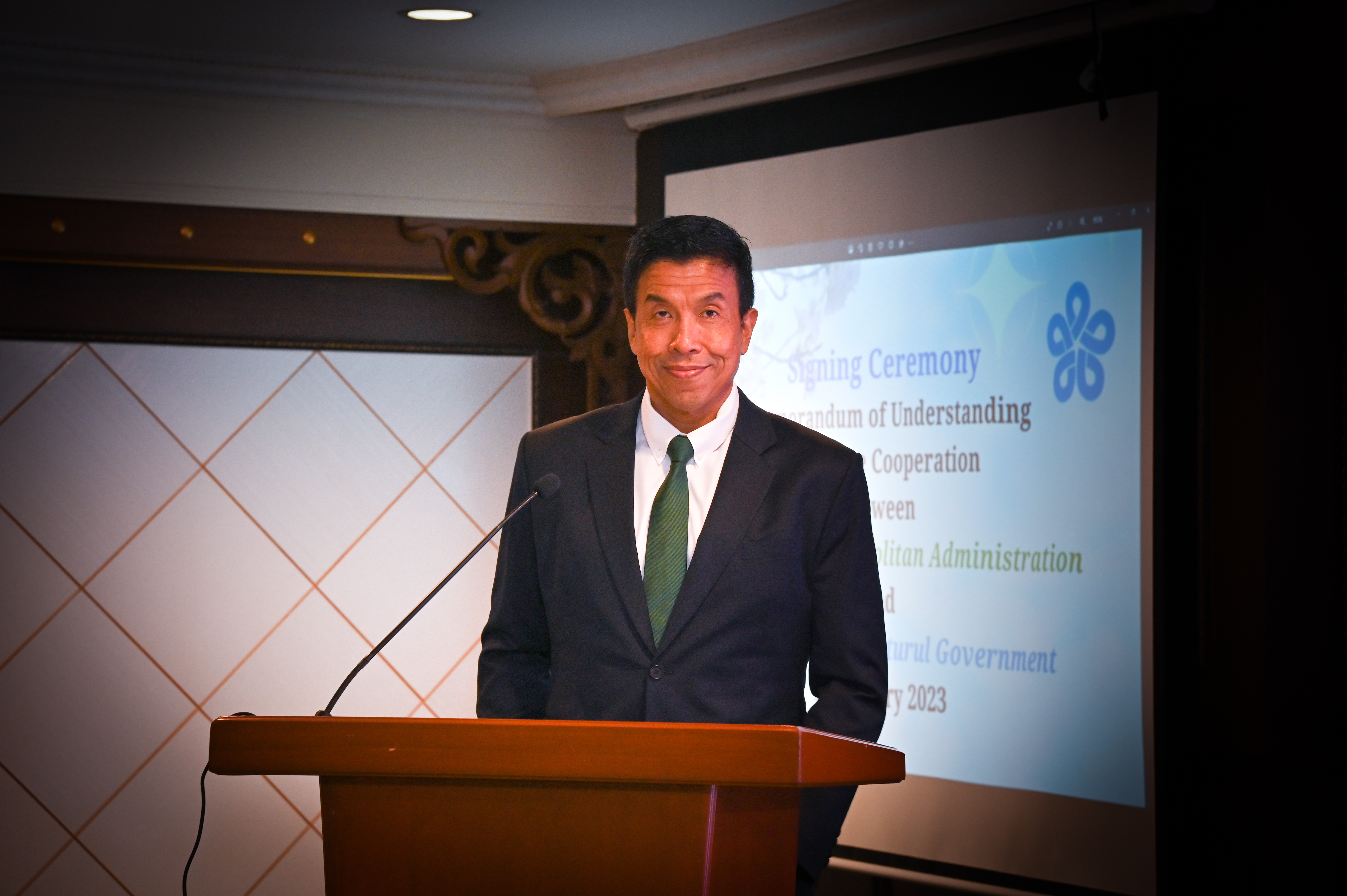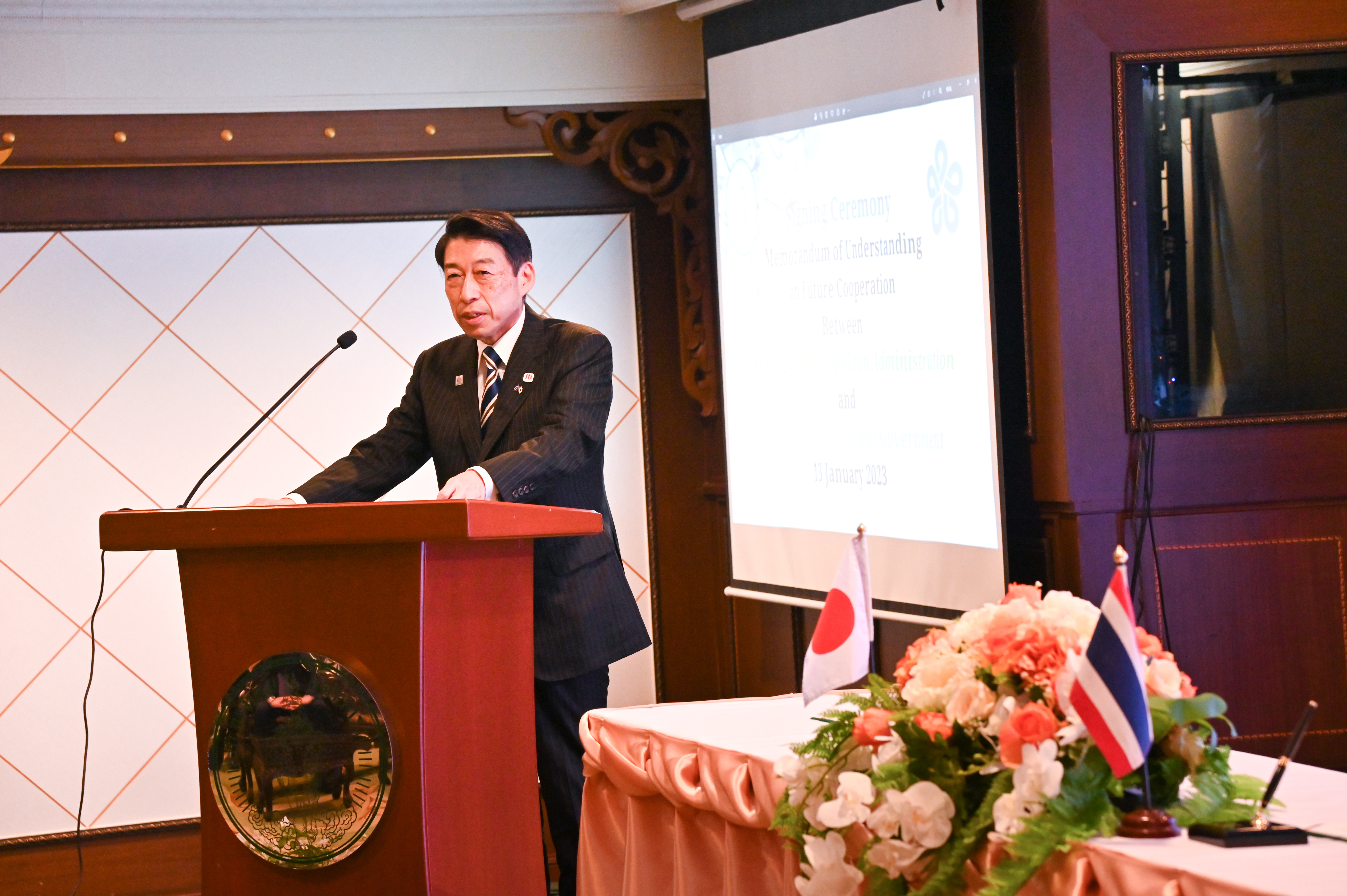 ผู้ว่าราชการจังหวัดฟูกูโอกะกล่าวแสดงความยินดีที่ได้มีโอกาสเดินทางเยือนกรุงเทพมหานครอย่างเป็นทางการเป็นครั้งแรกหลังจากการรับตำแหน่ง พร้อมกล่าวชื่นชมมิตรภาพที่ใกล้ชิดและยาวนานระหว่างทั้งสองฝ่ายหลังจากการสถาปนาความสัมพันธ์เมืองพี่เมืองน้องระหว่างกันในปี ๒๕๔๙ ผ่านความร่วมมือที่หลากหลาย เช่น เยาวชน สิ่งแวดล้อม การศึกษา วัฒนธรรม เป็นต้น และด้วยสถานการณ์โลกที่มีความเปลี่ยนแปลงอย่างรวดเร็ว การปรับตัวและเตรียมความพร้อมของเมืองจึงมีความสำคัญ จึงเห็นควรขยายความร่วมมือในสาขาใหม่ ๆ โดยเฉพาะการพัฒนาบุคลากรซึ่งเป็นกลไกสำคัญในการขับเคลื่อนการดำเนินภารกิจสู่ความสำเร็จ ทั้งนี้ ผู้ว่าราชการกรุงเทพมหานครกล่าวว่า การพัฒนาทรัพยากรมนุษย์ควรเริ่มตั้งแต่ระดับเยาวชนซึ่งจะมีบทบาทสำคัญในการสร้างสรรค์สังคม และขยายสู่ระดับเจ้าหน้าที่ ซึ่งจะส่งผลดีอย่างเป็นรูปธรรมในระยะยาว และการลงนามบันทึกความเข้าใจว่าด้วยความร่วมมือที่จะมีต่อกันในอนาคตจะเป็นโอกาสในการดำเนินความร่วมมือในสาขาที่มีความสนใจร่วมกันและเรื่องที่เป็นความท้าทายในปัจจุบันได้อย่างใกล้ชิดมากยิ่งขึ้น เช่น การท่องเที่ยว เศรษฐกิจ นวัตกรรม การจัดการภัยพิบัติ สังคมผู้สูงอายุ เป็นต้น