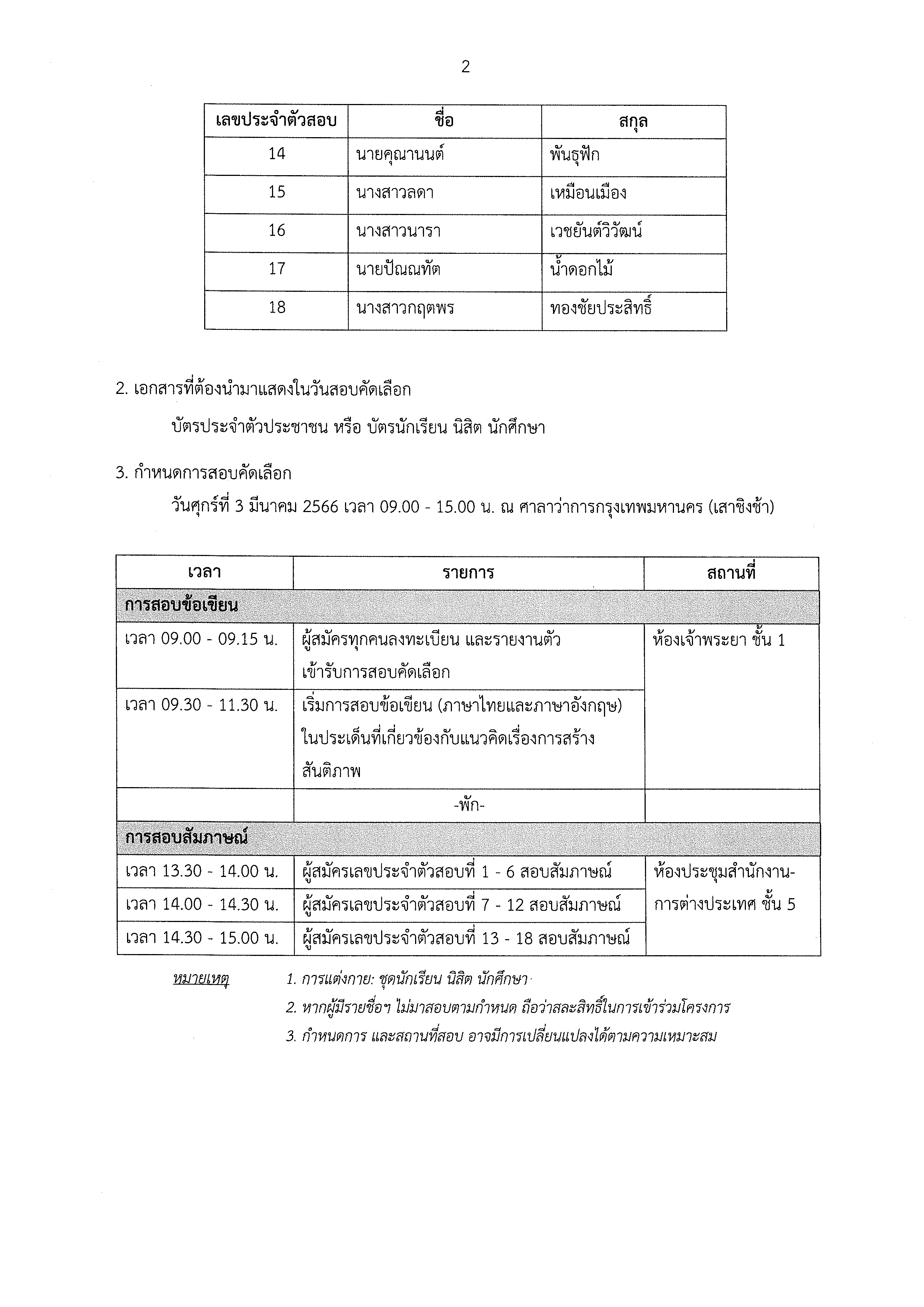 บัดนี้ ได้ตรวจคุณสมบัติของผู้สมัครเข้าร่วมประชุม ฯ จึงประกาศรายชื่อผู้มีสิทธิ์สอบข้อเขียนและสัมภาษณ์ รวมทั้ง วัน เวลา สถานที่ และเกณฑ์การคัดเลือก