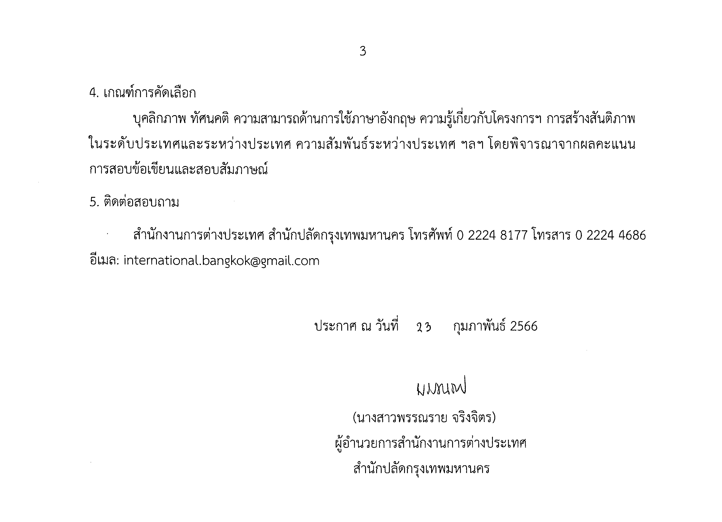 ประกาศสำนักงานการต่างประเทศ เรื่อง รายชื่อผู้มีสิทธิ์เข้ารับการคัดเลือกการประชุมเยาวชนนานาชาติเพื่อสันติภาพในอนาคต (IYCPF)