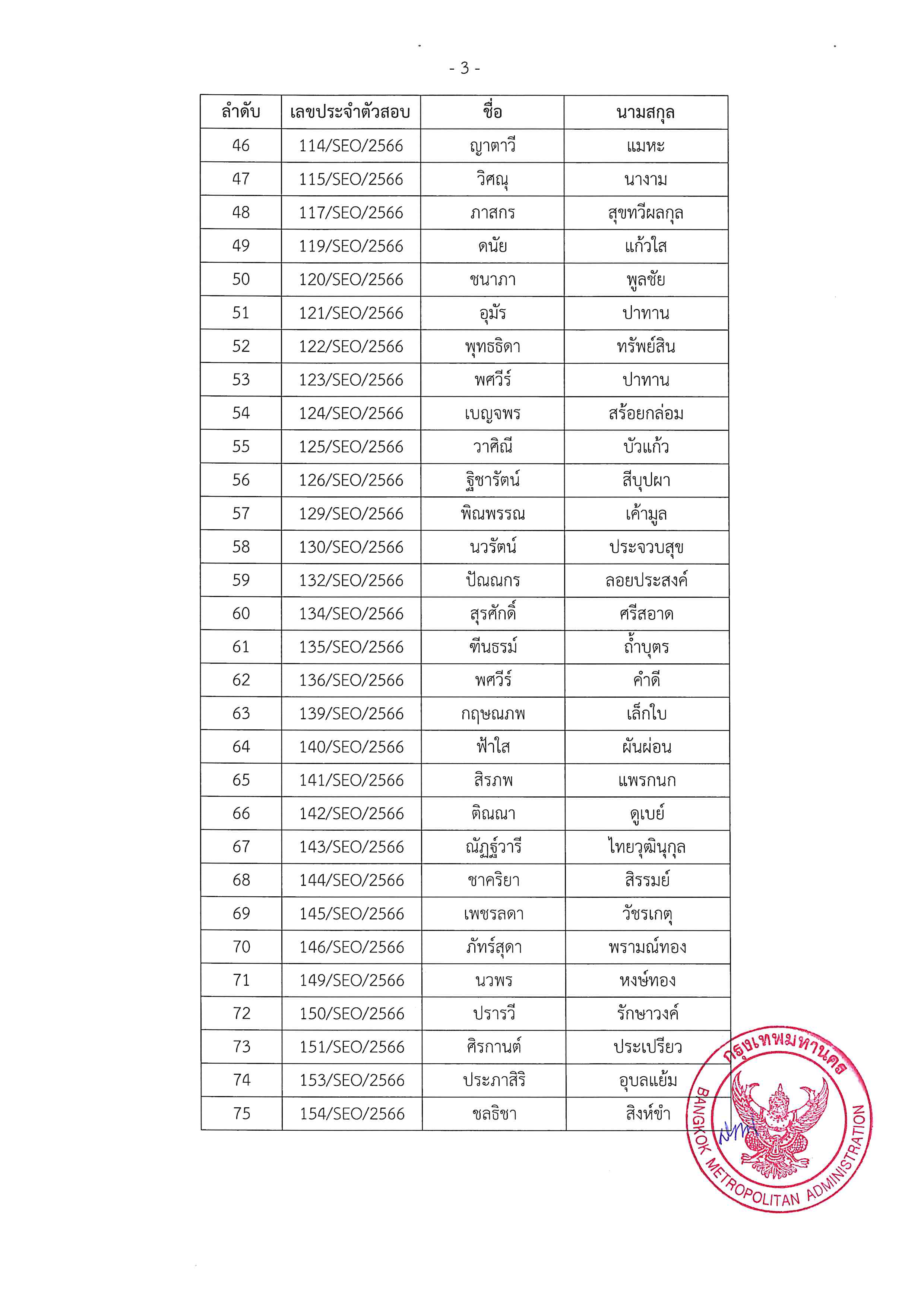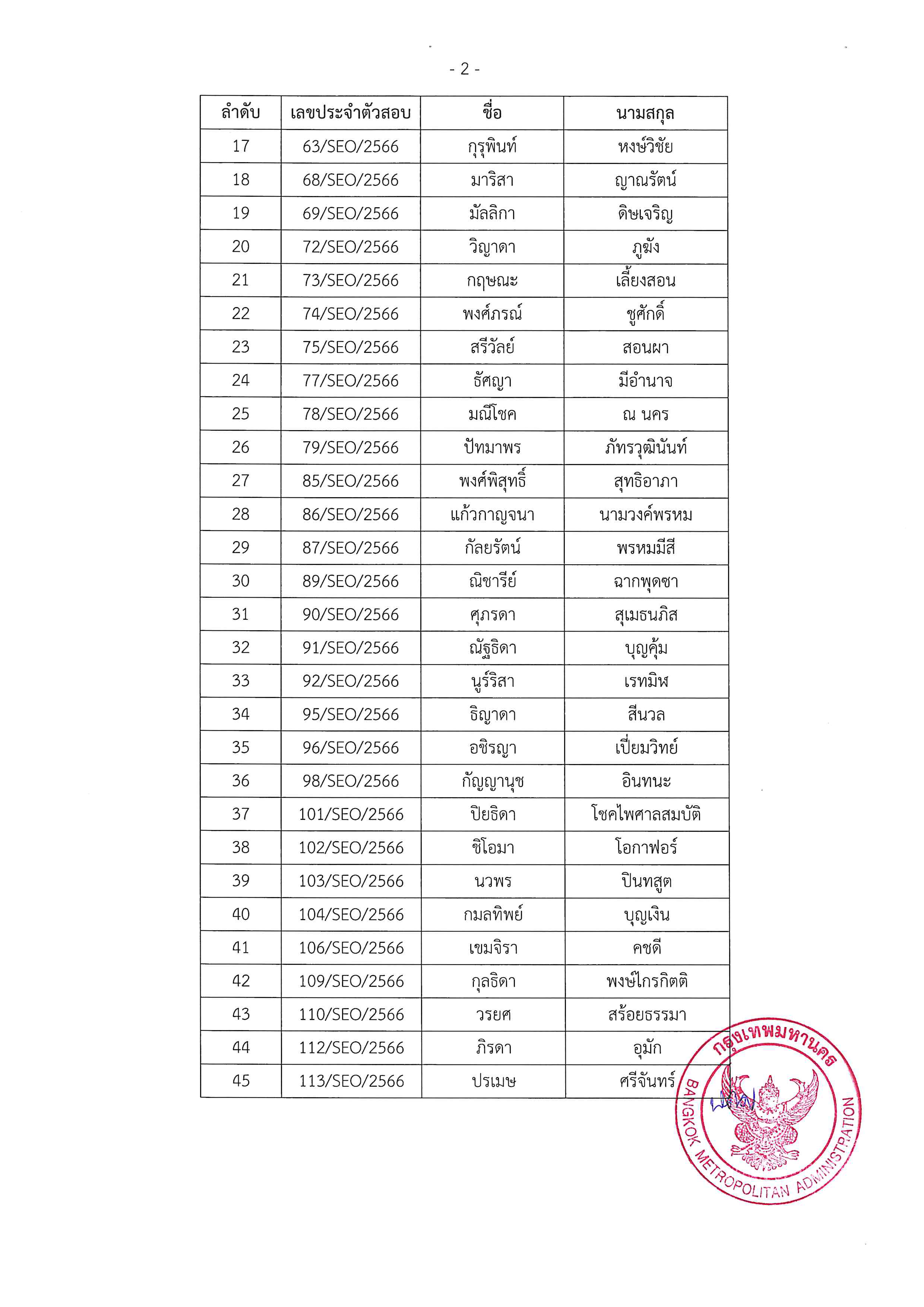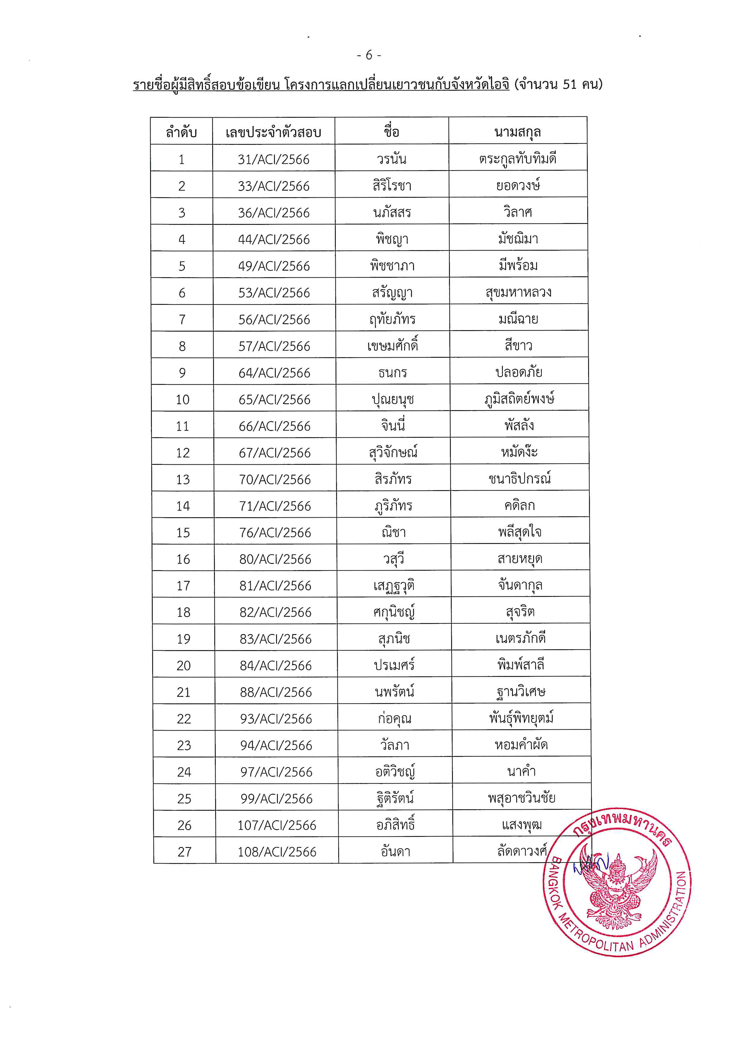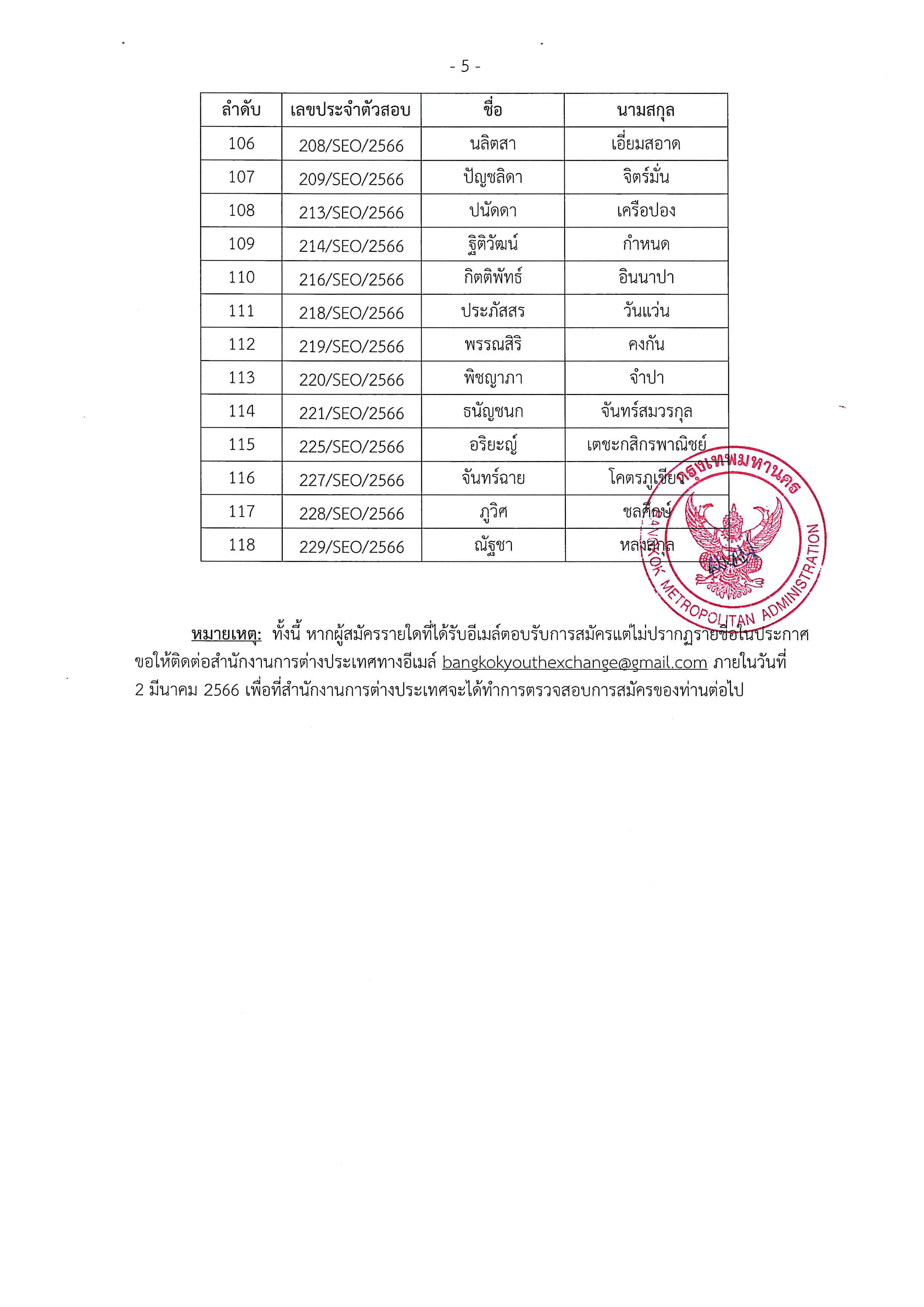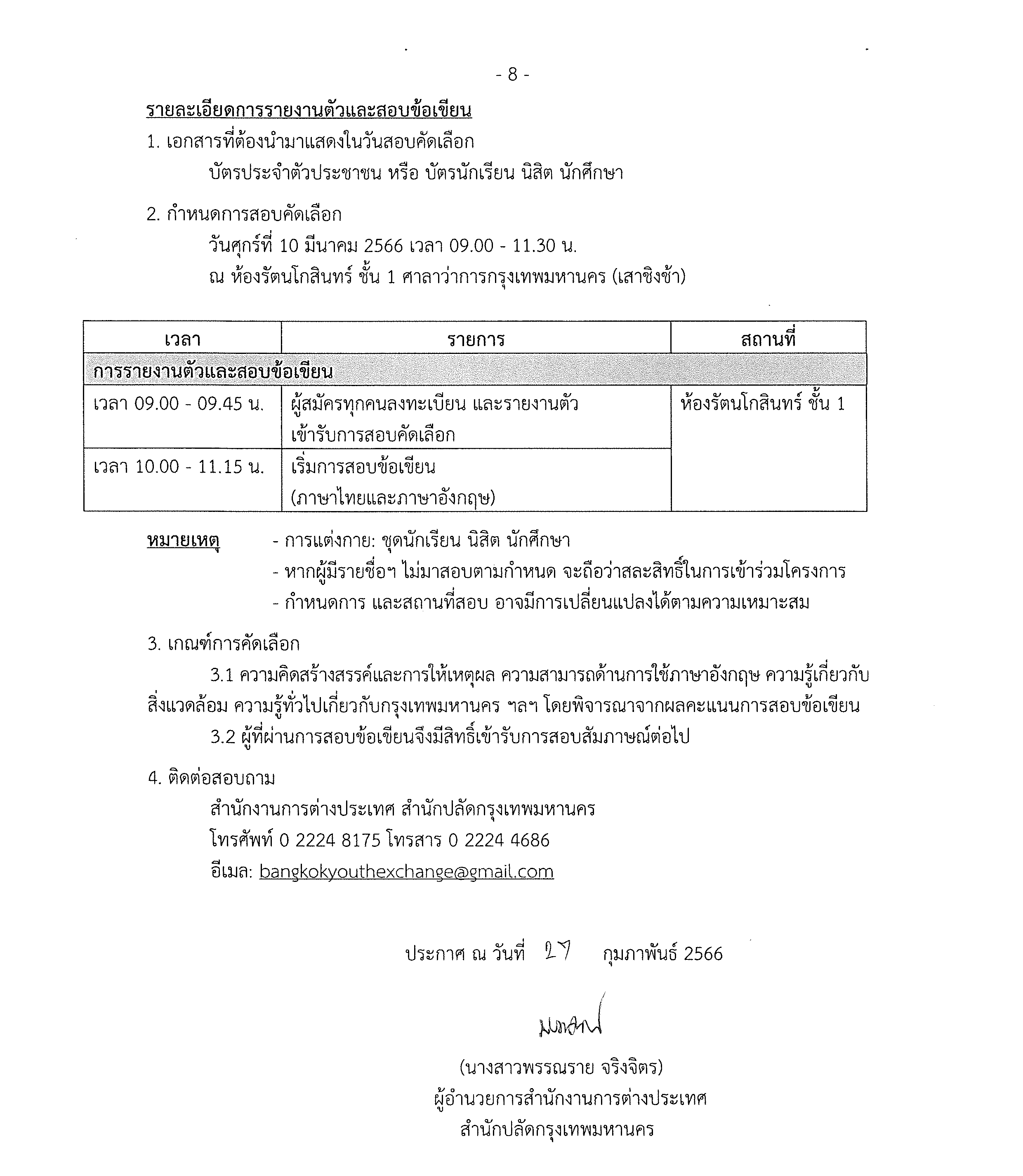 ประกาศสำนักงานการต่างประเทศ สำนักปลัดกรุงเทพมหานคร เรื่อง รายชื่อผู้มีสิทธิ์้เข้ารับการคัดเลือกเพื่อเข้าร่วม โครงการแลกเปลี่ยนเยาวชนกับเมืองพี่เมืองน้องของกรุงเทพมหานคร ประจำปี พ.ศ. 2566 (โซล , ไอจิ)