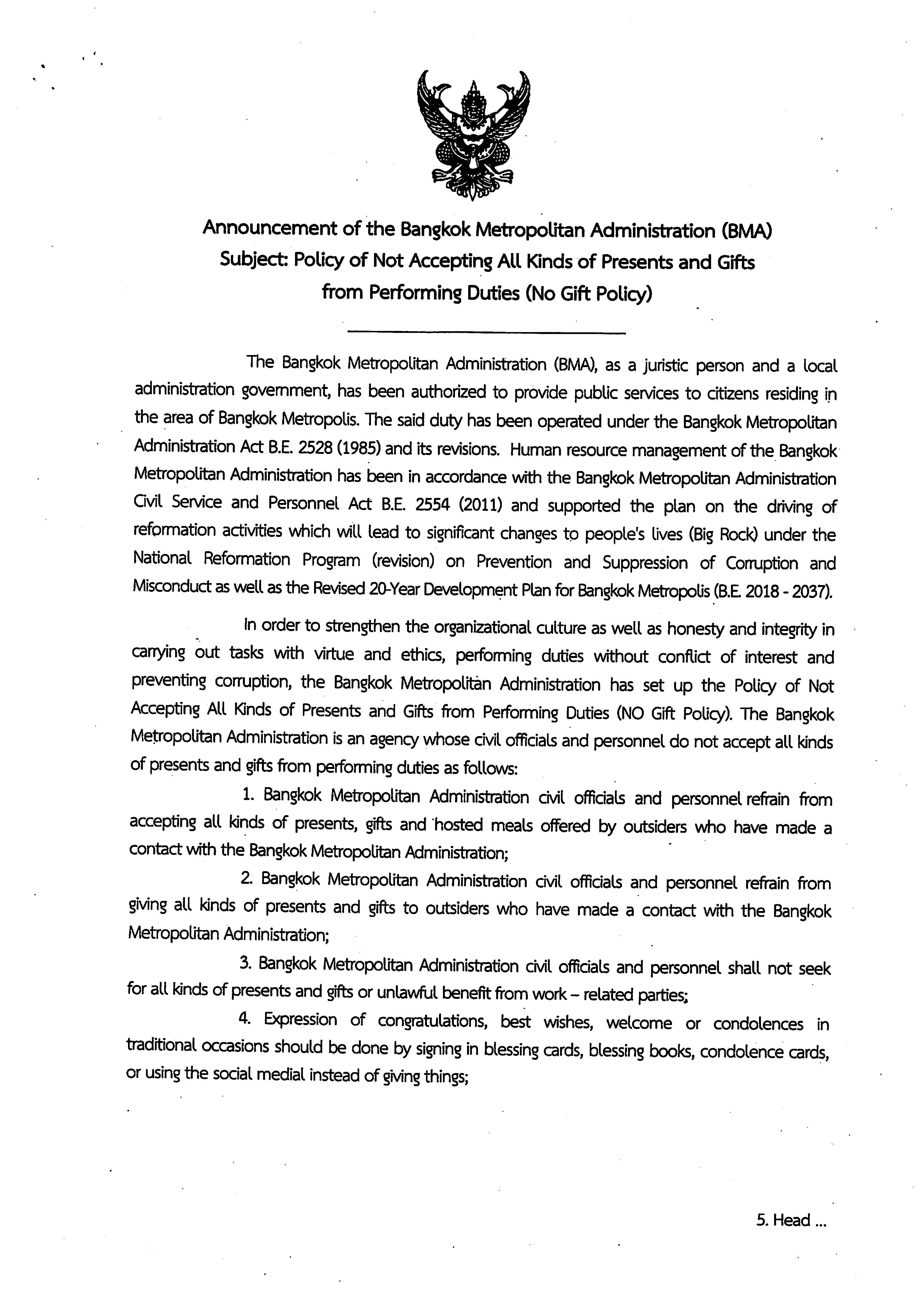 นโยบายการไม่รับของขวัญและของกำนัลทุกชนิดจากการปฏิบัติหน้าที่ (No Gift Policy)