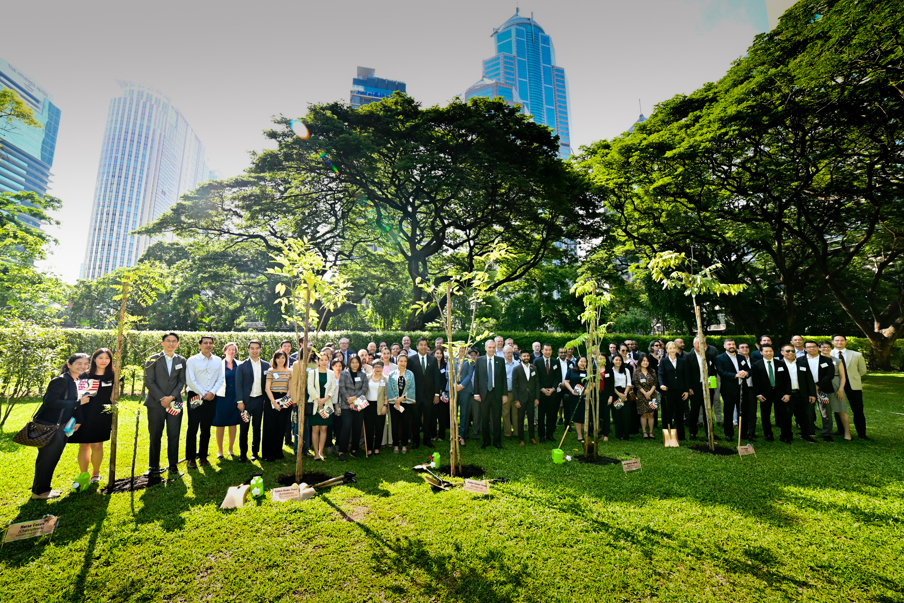 1. ต้นราชพฤกษ์ (2 ต้น) - ต้นไม้ประจำชาติไทย สื่อถึงความเป็นสิริมงคล เพิ่มพูน รุ่งเรือง ยั่งยืน และสะท้อนถึงสายสัมพันธ์อันแน่นแฟ้นของไทย - สหรัฐอเมริกาที่ยาวนานถึง 190 ปี