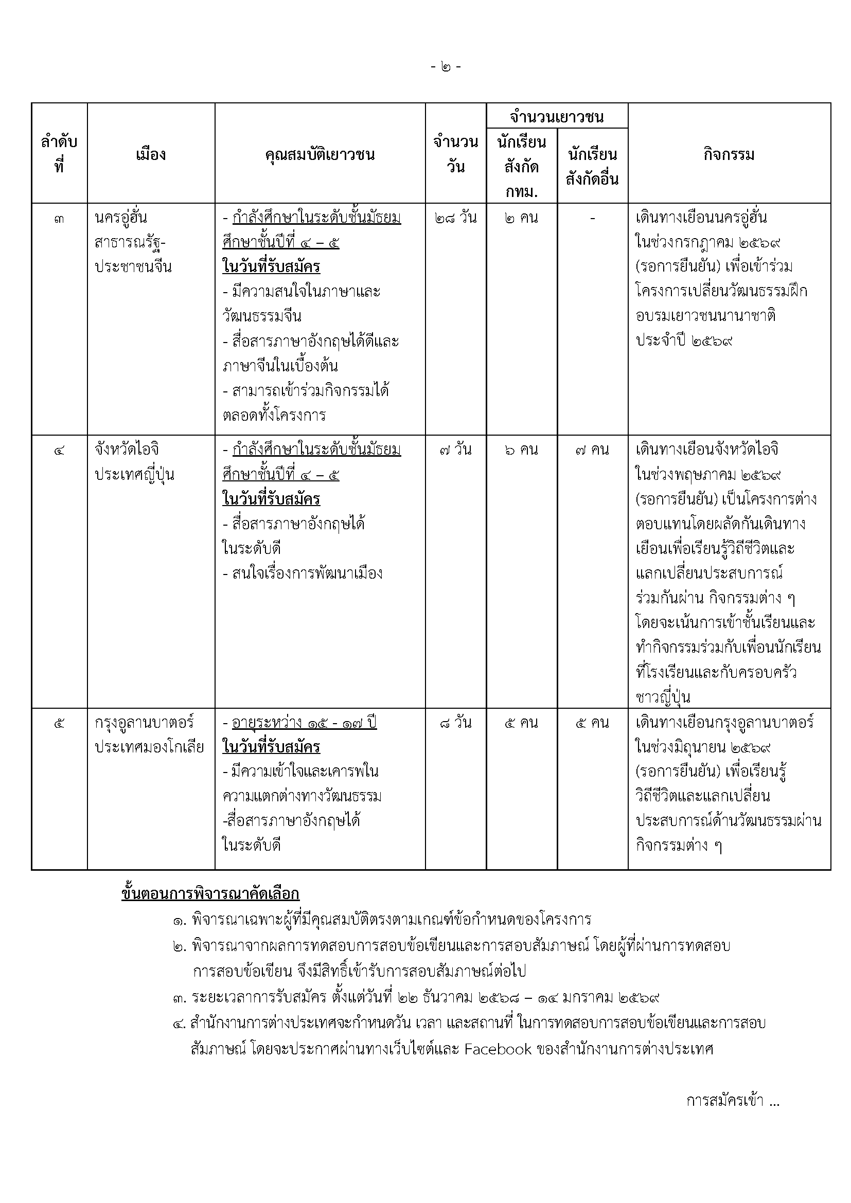กรุงเทพมหานครร่วมกับเมืองพี่เมืองน้อง ประจำปีงบประมาณ พ.ศ. 2569 การแลกเปลี่ยนเยาวชนกับกรุงโซล (สาธารณรัฐเกาหลี) นครเซี่ยงไฮ้ นครอู่ฮั่น (สาธารณรัฐประชาชนจีน) จังหวัดไอจิ (ประเทศญี่ปุ่น) และกรุงอูลานบาตอร์ (ประเทศมองโกเลีย)