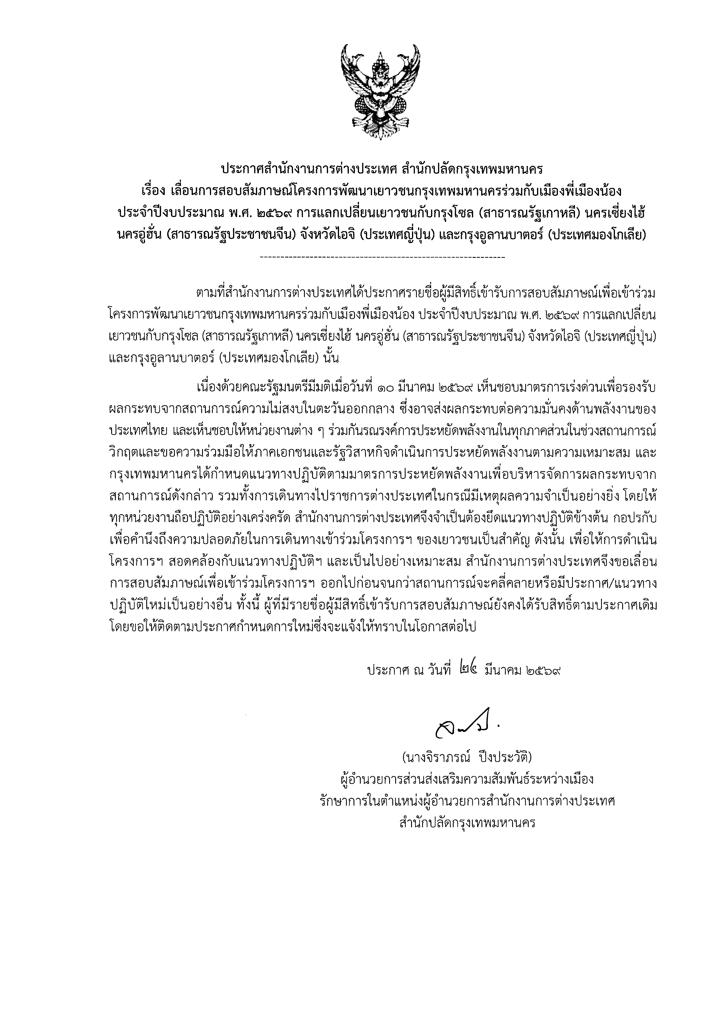 เรื่อง เลื่อนการสอบสัมภาษณ์โครงการพัฒนาเยาวชนกรุงเทพมหานครร่วมกับเมืองพี่เมืองน้อง ประจำปีงบประมาณ พ.ศ. 2569