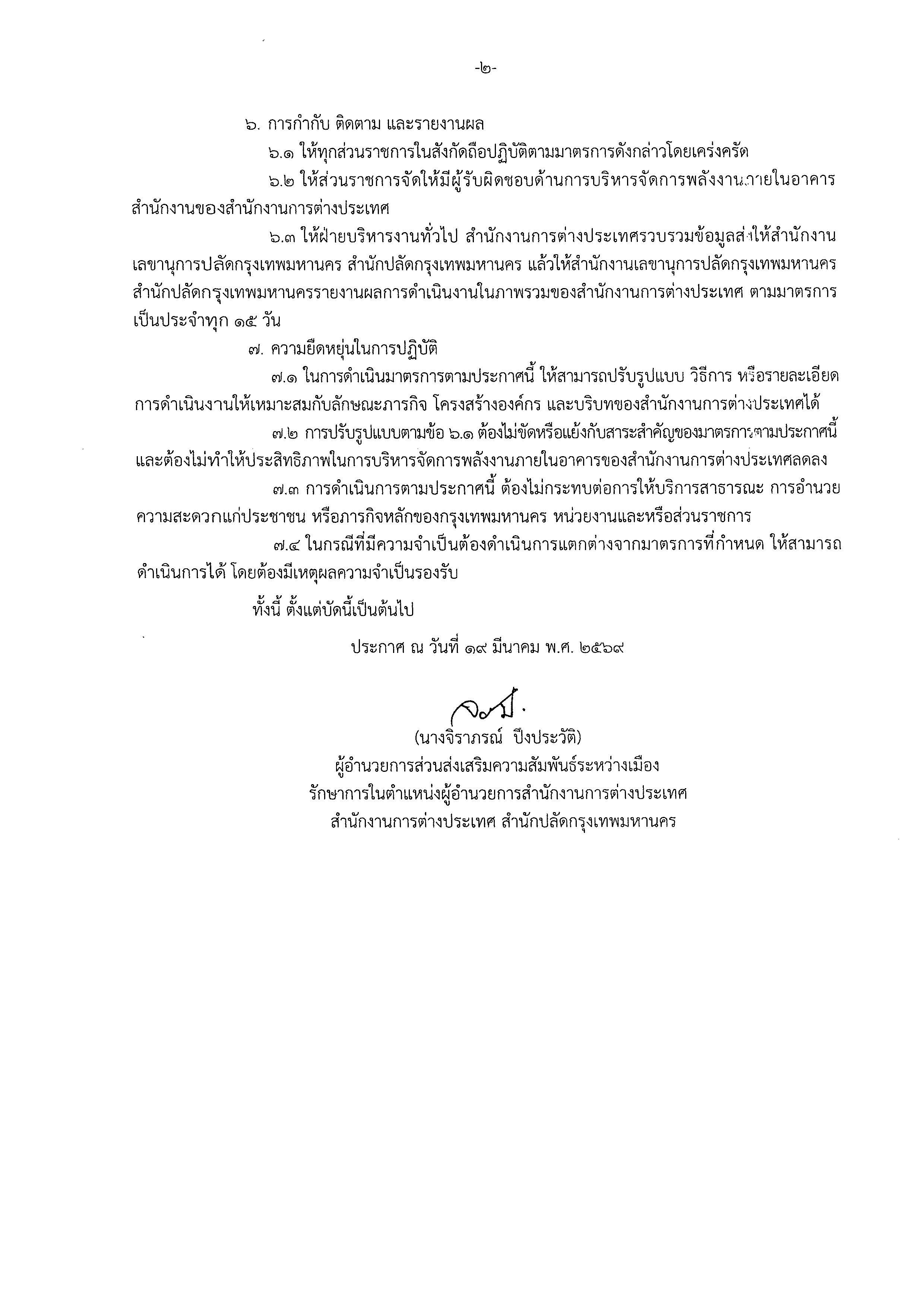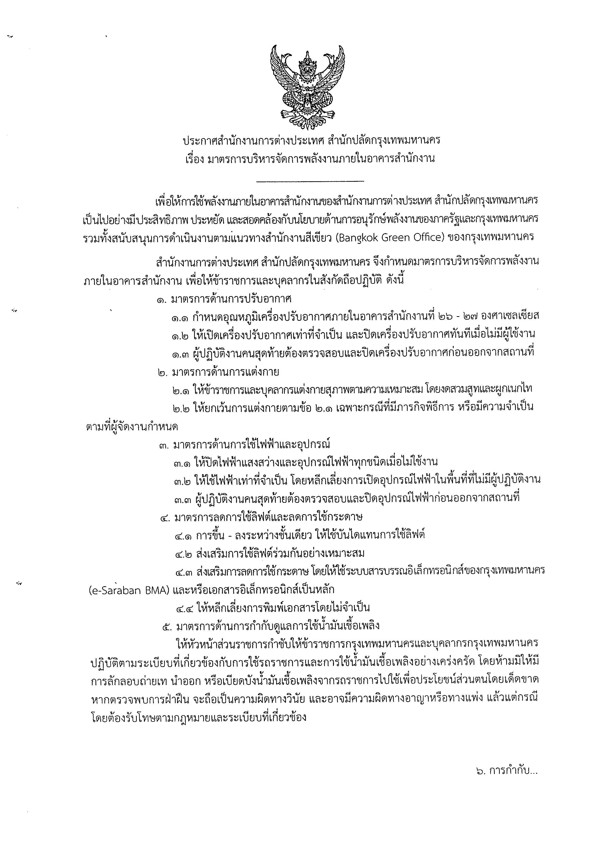ประกาศสำนักงานการต่างประเทศ สำนักปลัดกรุงเทพมหานคร เรื่อง มาตรการบริหารจัดการพลังงานภายในอาคารสำนักงาน
